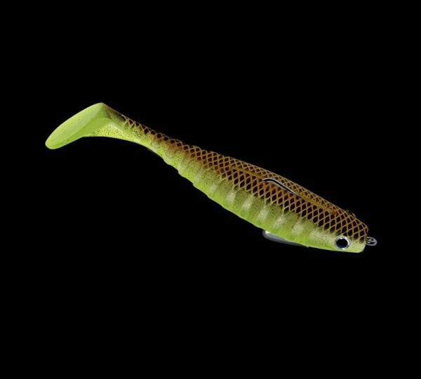 Sein gedrungener Körper ist gespalten, um einen großen, speziell für diesen Köder entwickelten Offset aufzunehmen, unter dem sich ein relativ leichtes Blei befindet, das wie bei einem Segelboot als Kiel dient.